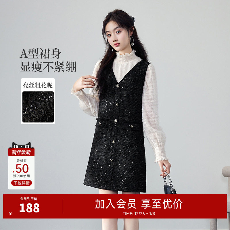 柒院家大码女粗花呢小香风亮片V领背心连衣裙2025秋冬宽松中长裙