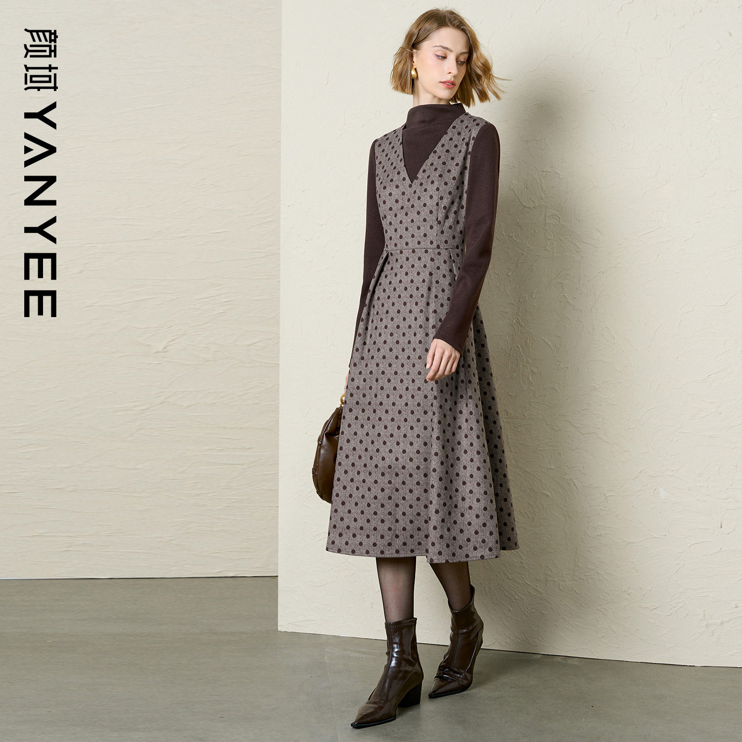 颜域波点V领背心连衣裙女冬2025新款长款收腰修身过膝内搭打底裙