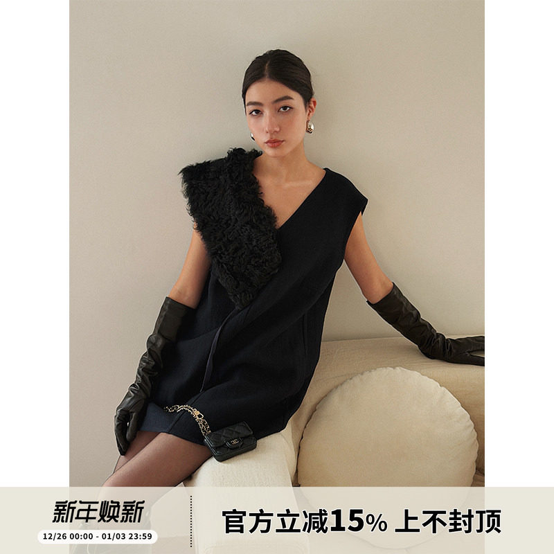 Maven Lin 优雅映现 100%羊毛V领无袖背心裙女气质双面毛呢连衣裙
