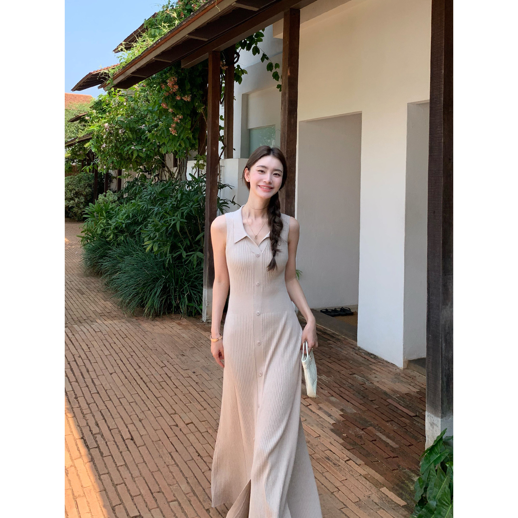 MULVAN v领针织连衣裙女夏季修身无袖背心裙高级感气质长裙