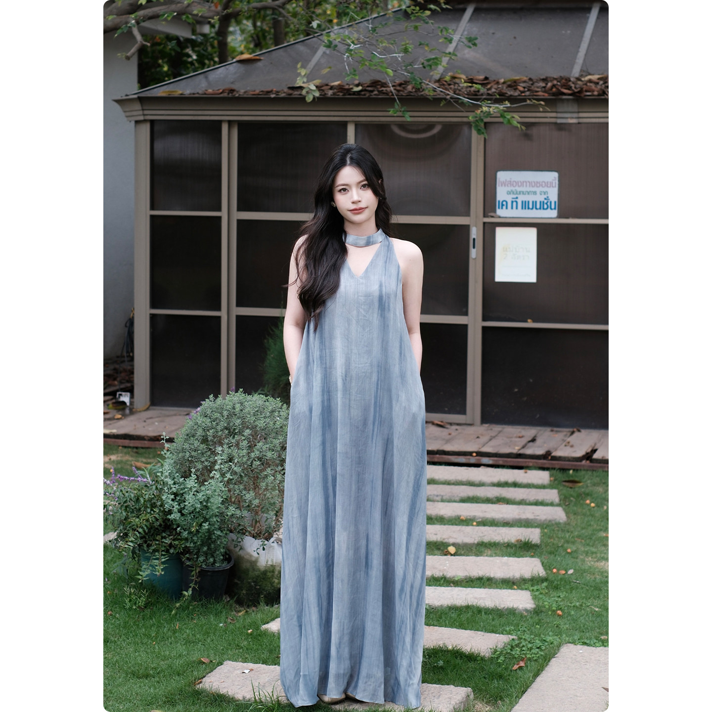 Maven Lin 极简高支1OO亚麻V领挂脖连衣裙女度假风无袖背心长裙