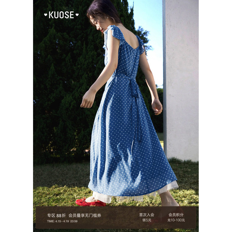 阔色蓝色波点小飞袖v领连衣裙新26春夏季女收腰法式背心裙长裙子