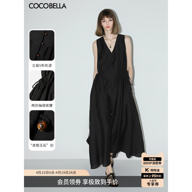 COCOBELLA静奢风V领无袖连衣裙长裙玉石扣小黑裙通勤背心裙FR7008