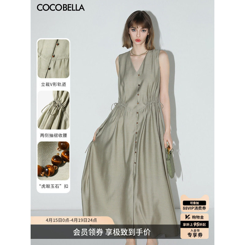 COCOBELLA气质通勤V领无袖连衣裙长裙女玉石扣抽绳背心裙FR7008-3