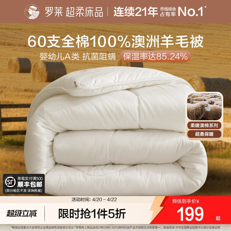 罗莱家纺澳洲进口羊毛被全棉100%纯羊毛被子冬被加厚保暖被芯学生