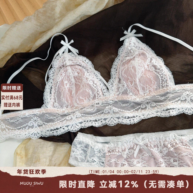 法式三角杯内衣女纯欲风性感蕾丝少女无钢圈小胸超薄款文胸罩套装