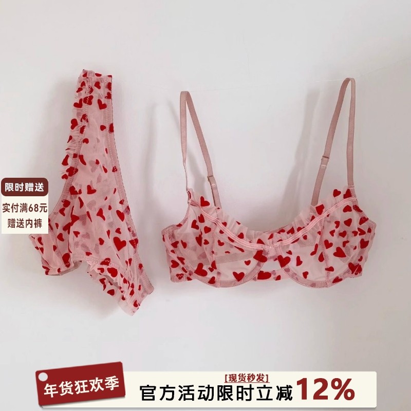 纯欲性感内衣爱心蕾丝网纱大胸显小收副乳超薄款文胸套装2025新款