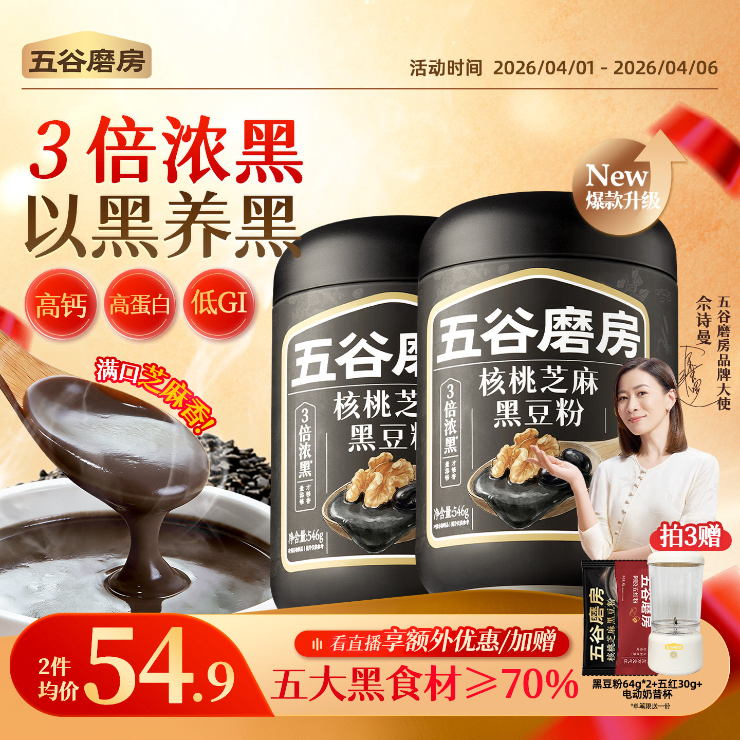 五谷磨房核桃芝麻黑豆粉黑芝麻糊2罐五黑粉营养早餐低GI代餐0添加