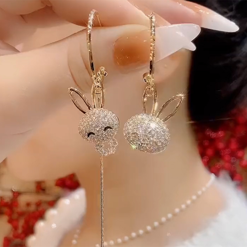 2025新款不对称兔子耳环时尚气质个性微镶耳坠高级感长款流苏耳饰
