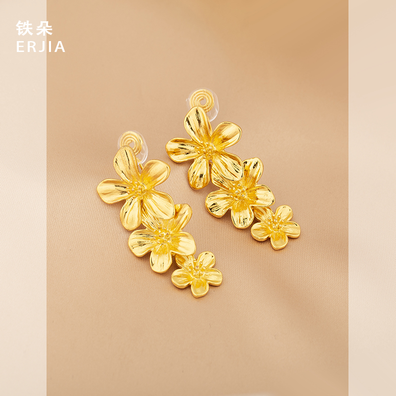 欧美流苏长款金属花朵耳钉气质个性夸张设计耳坠无耳洞蚊香盘耳夹