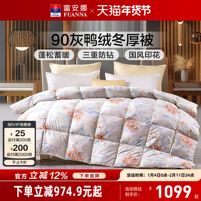 富安娜家纺羽绒被 90灰鸭绒被子冬被保暖加厚被防羽ins风羽绒被褥