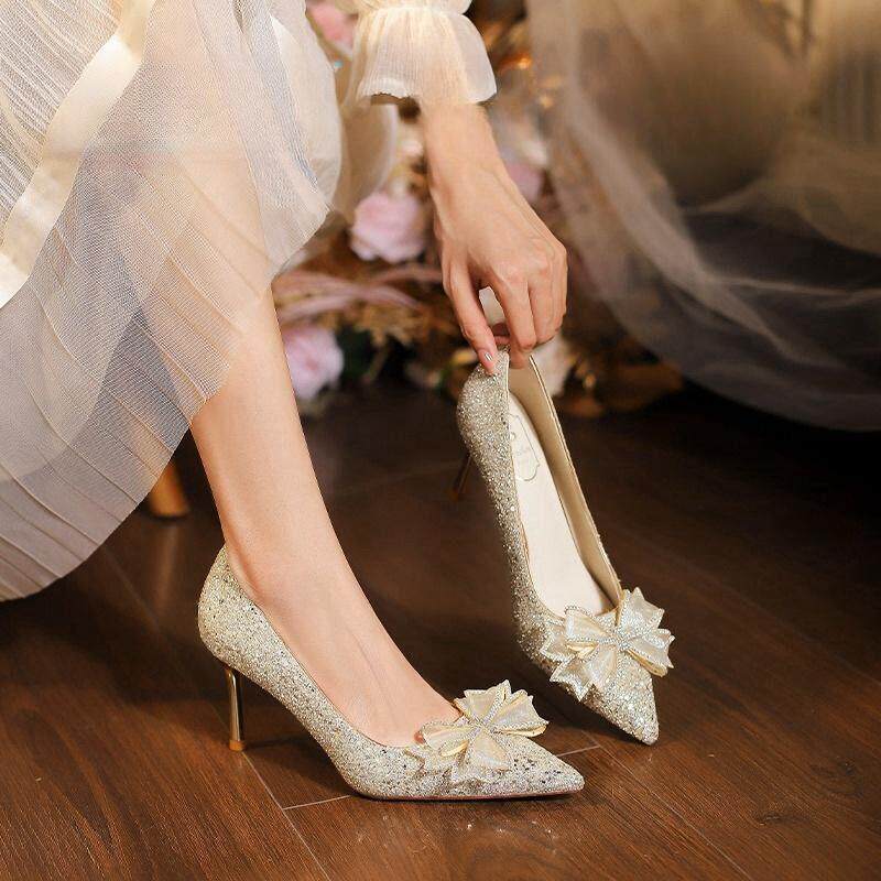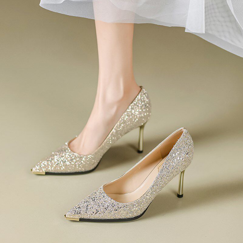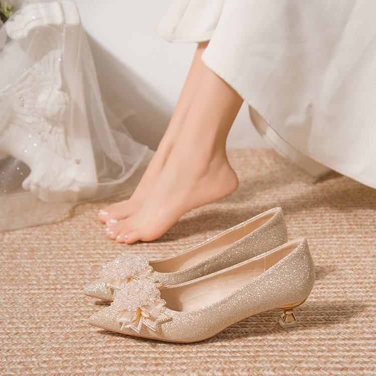 春季法式香槟色亮片婚鞋女细跟主婚纱鞋新娘鞋绝美秀禾尖头0224d