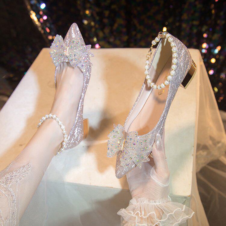 新款婚鞋女细跟尖头蝴蝶结单鞋伴娘婚礼银色水晶高跟鞋18岁成年礼