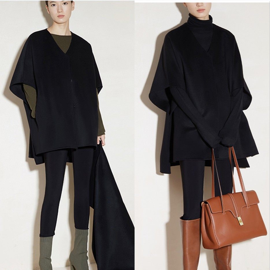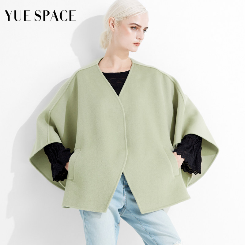 YUESPACE短款双面羊毛斗篷女大衣外套宽松V领时尚百搭蝙蝠袖秋冬