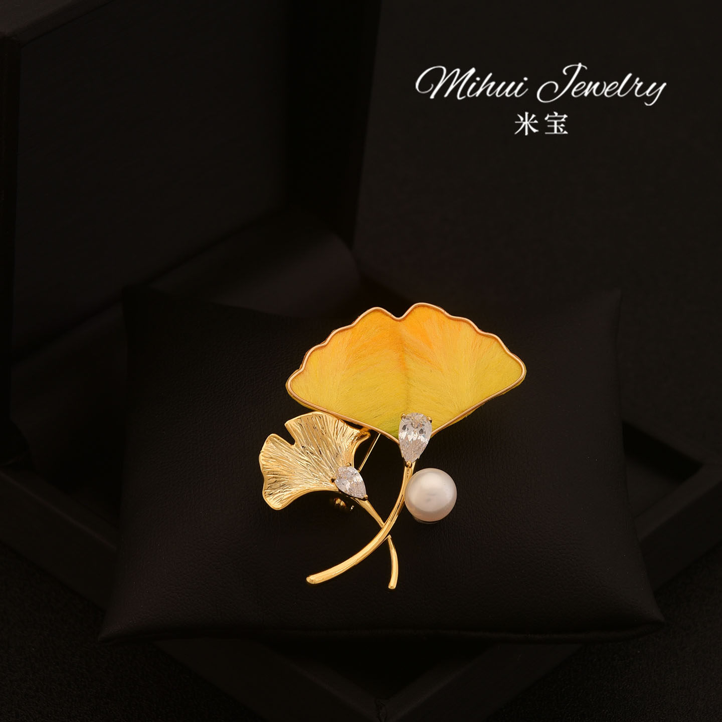 非遗绒花天然珍珠气质百搭银杏叶胸针女大衣外套高档胸花别针固定
