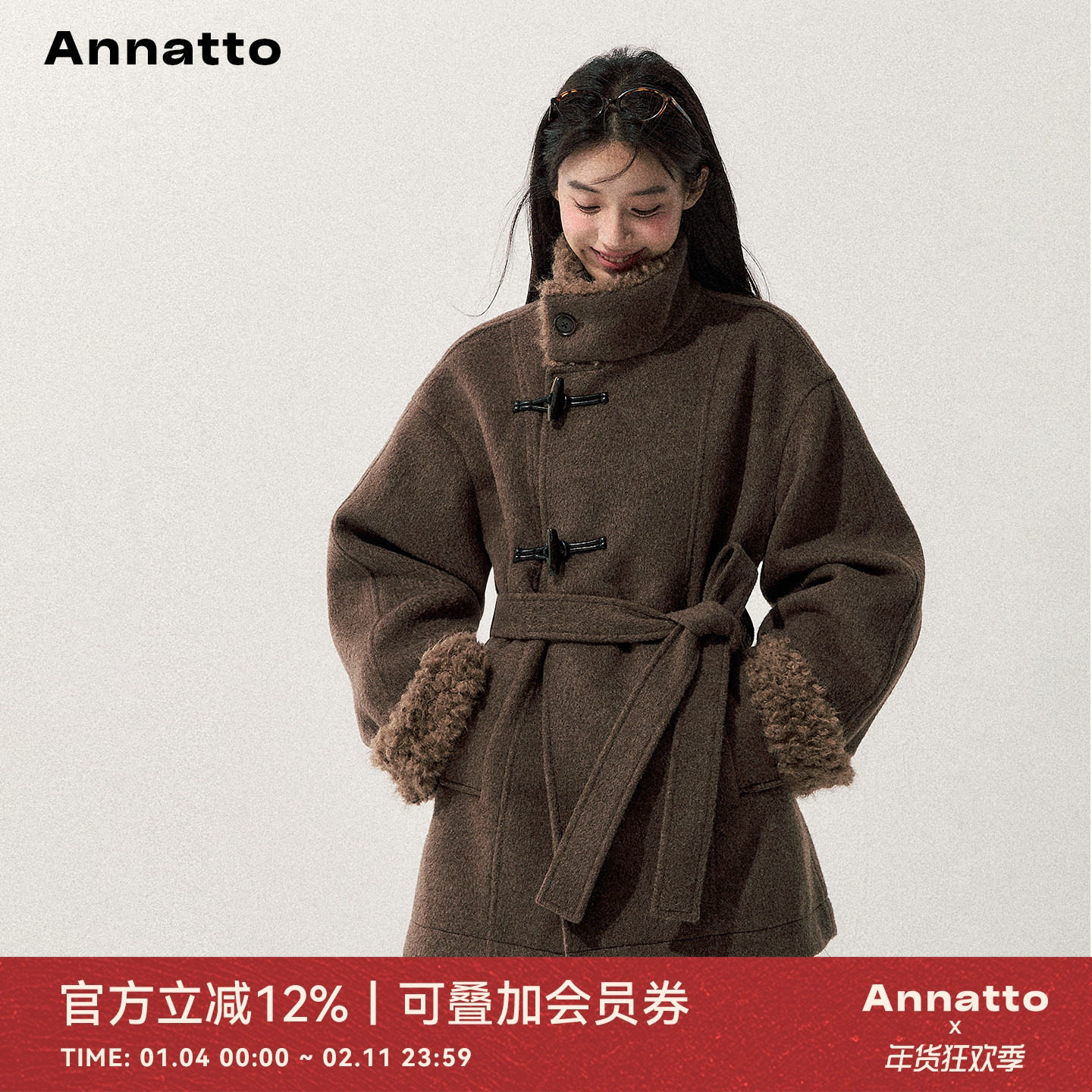 ANNATTO 风起时 冬季含羊毛棕色收腰呢子中长款大衣毛毛外套女