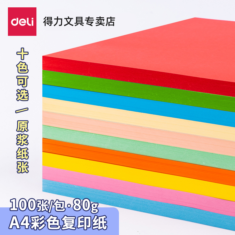得力彩色A4复印纸彩色复印纸80g彩色打印纸手工手帐彩色纸学生办公用纸彩色100张混色装粉色折纸图文广告彩纸
