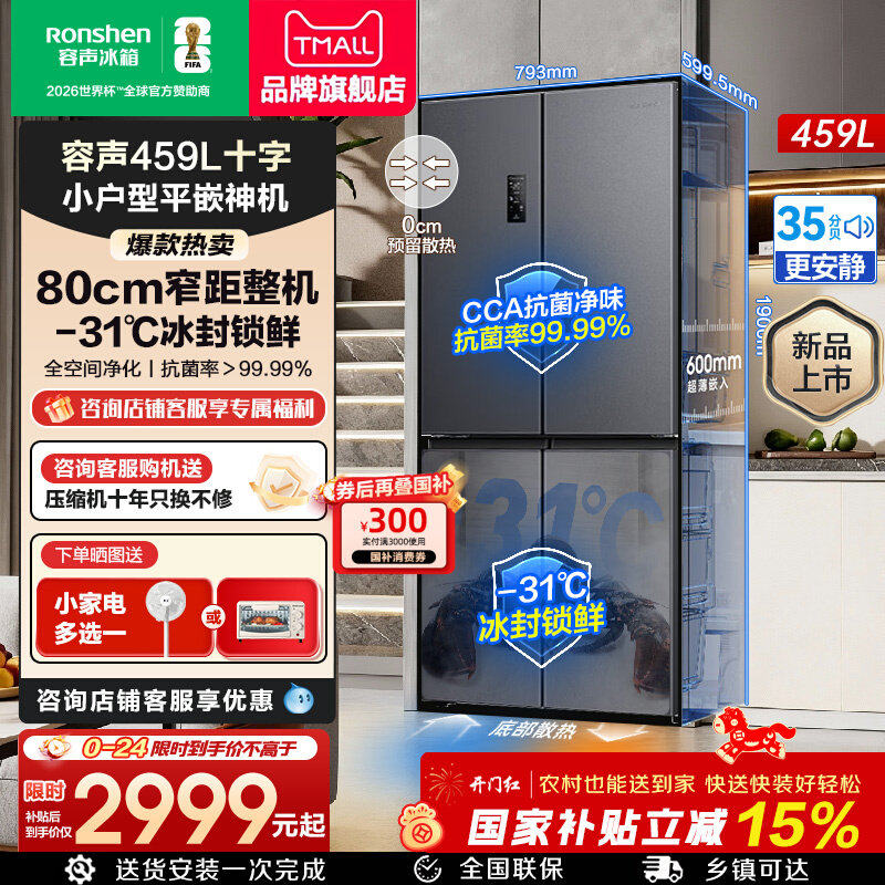 【新品】容声冰箱453L升超薄零嵌十字双对开四门一级能效官方正品