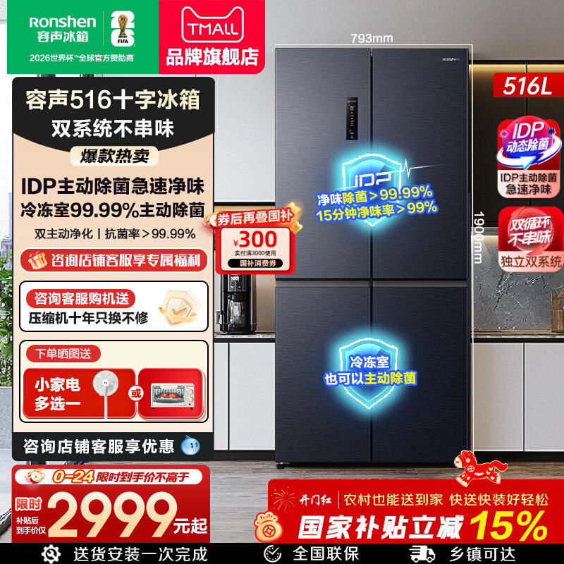 【526十字款】容声冰箱516L双净IDP双系统十字四门家用无霜旗舰店