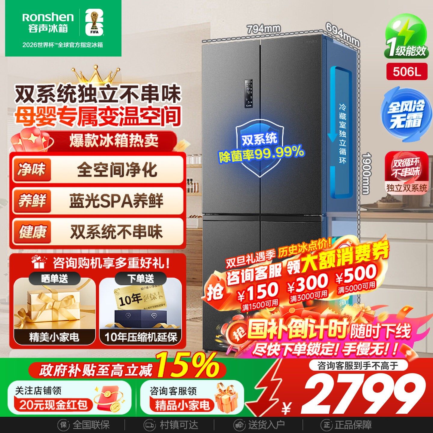 容声526L双净双系统法式多门一级能效变频家用冰箱以旧换新补贴
