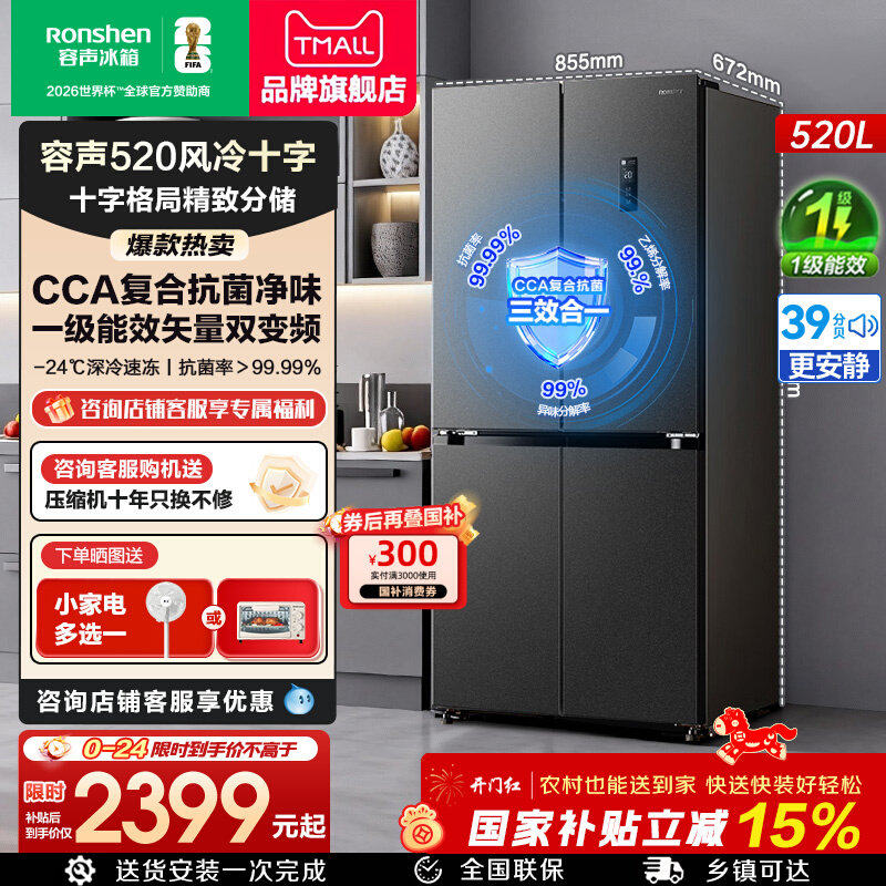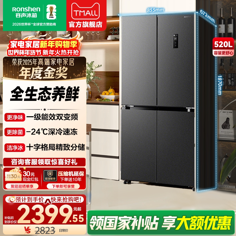 容声冰箱520升十字双对开四门一级能效家用无霜变频节能官方正品