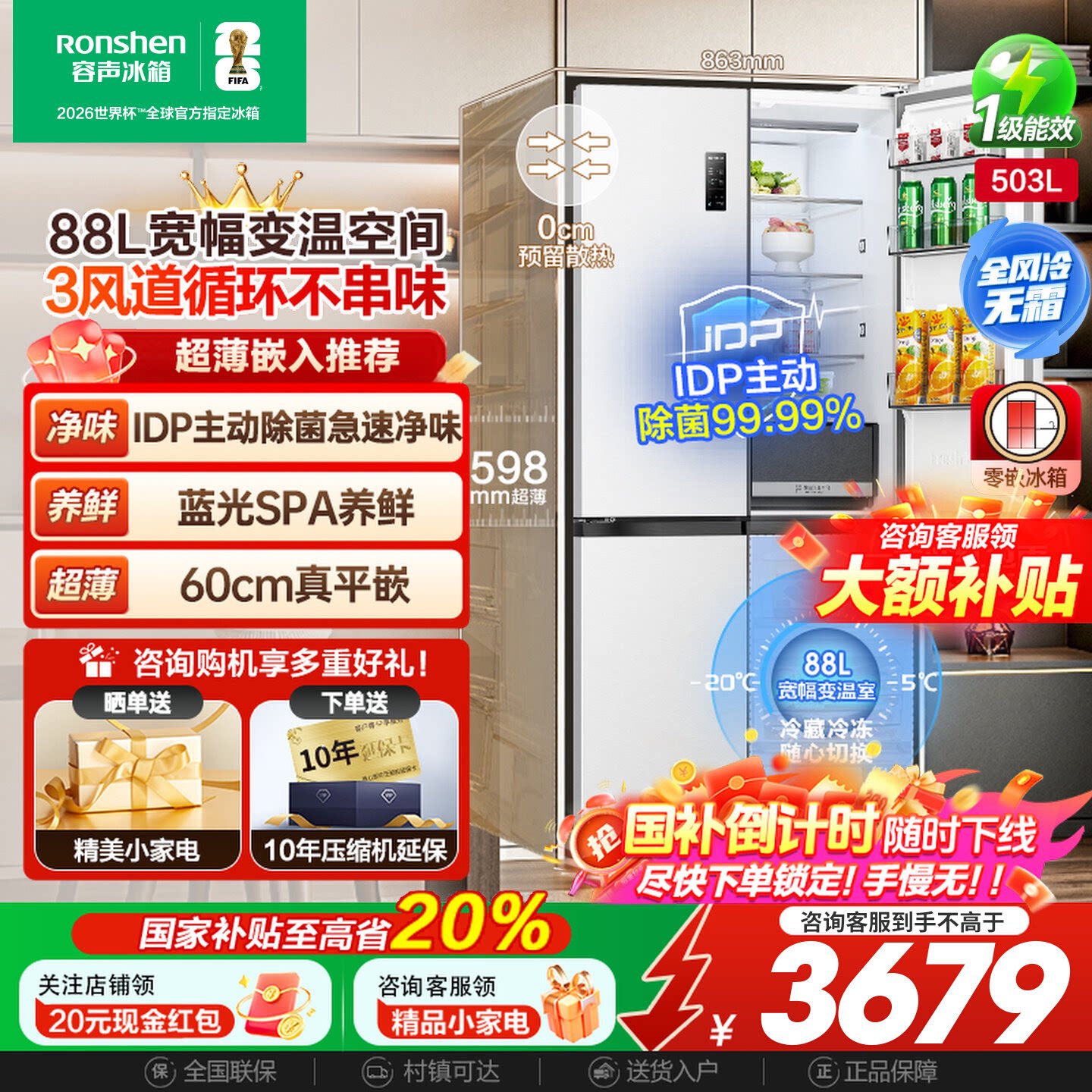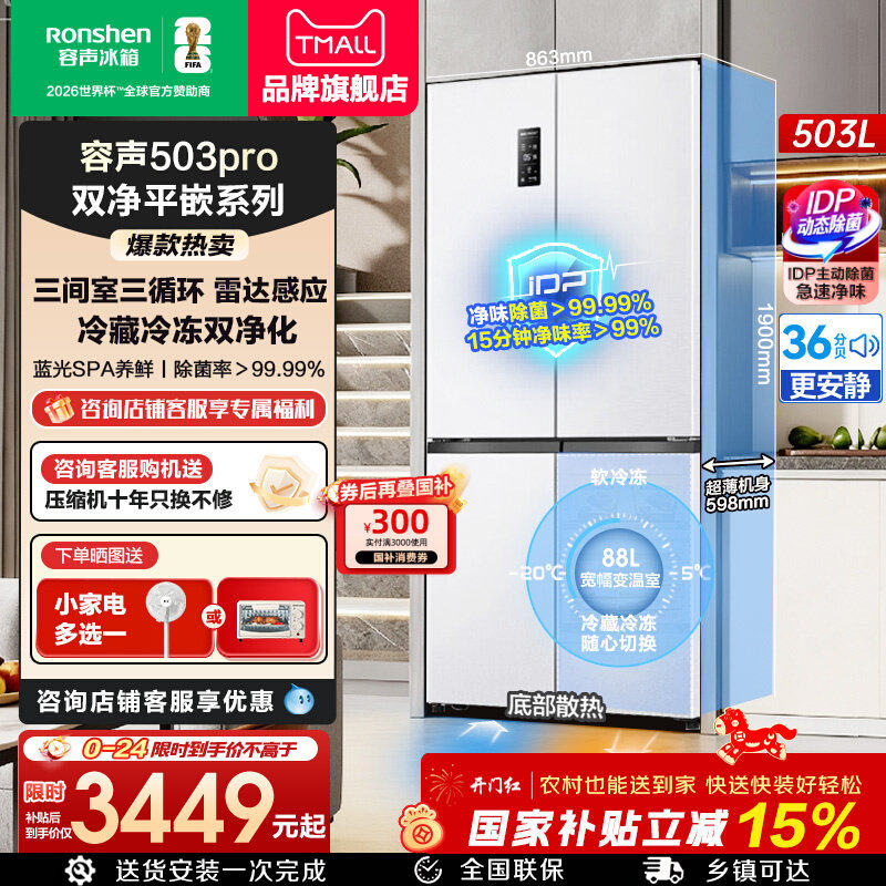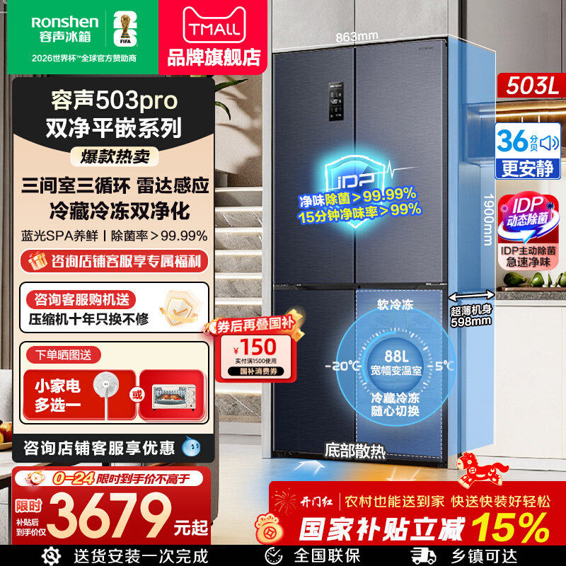 容声冰箱503pro十字对开四门IDP除菌三循环嵌入一级能效官方正品