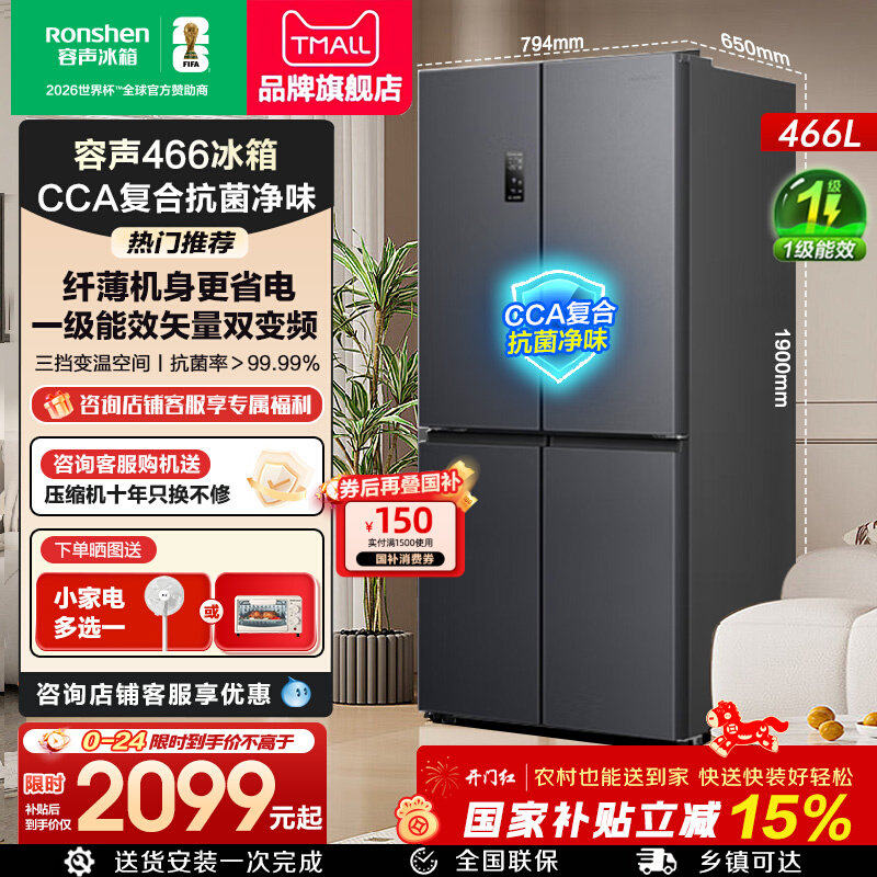 容声冰箱466L升十字双对开四门一级能效家用无霜变频节能官方正品