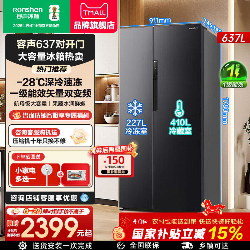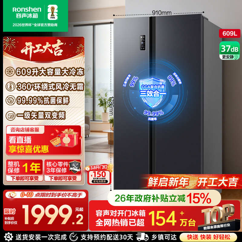 容声冰箱609L对开双开门大容量风冷家用一级嵌入以旧换新补贴281