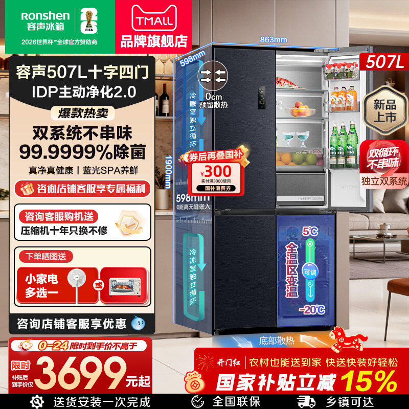【双系统】容声冰箱507L十字四开门IDP净味家用超薄零嵌官方正品