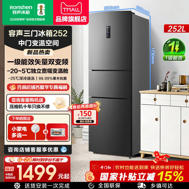 容声252/253L三门冰箱风冷无霜变频一级能效家用小型租房换新补贴
