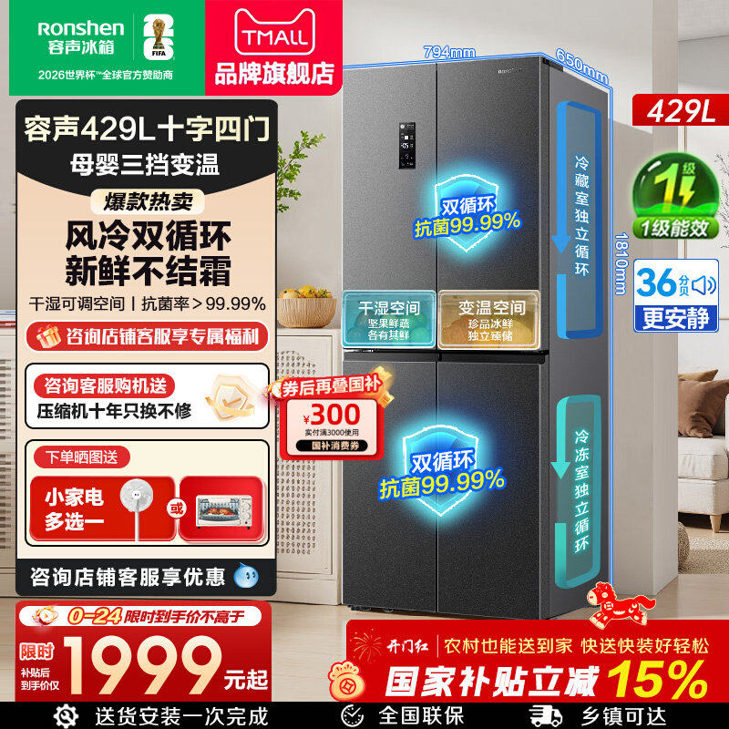 容声冰箱429L升十字双对开四门一级能效家用无霜变频节能官方正品