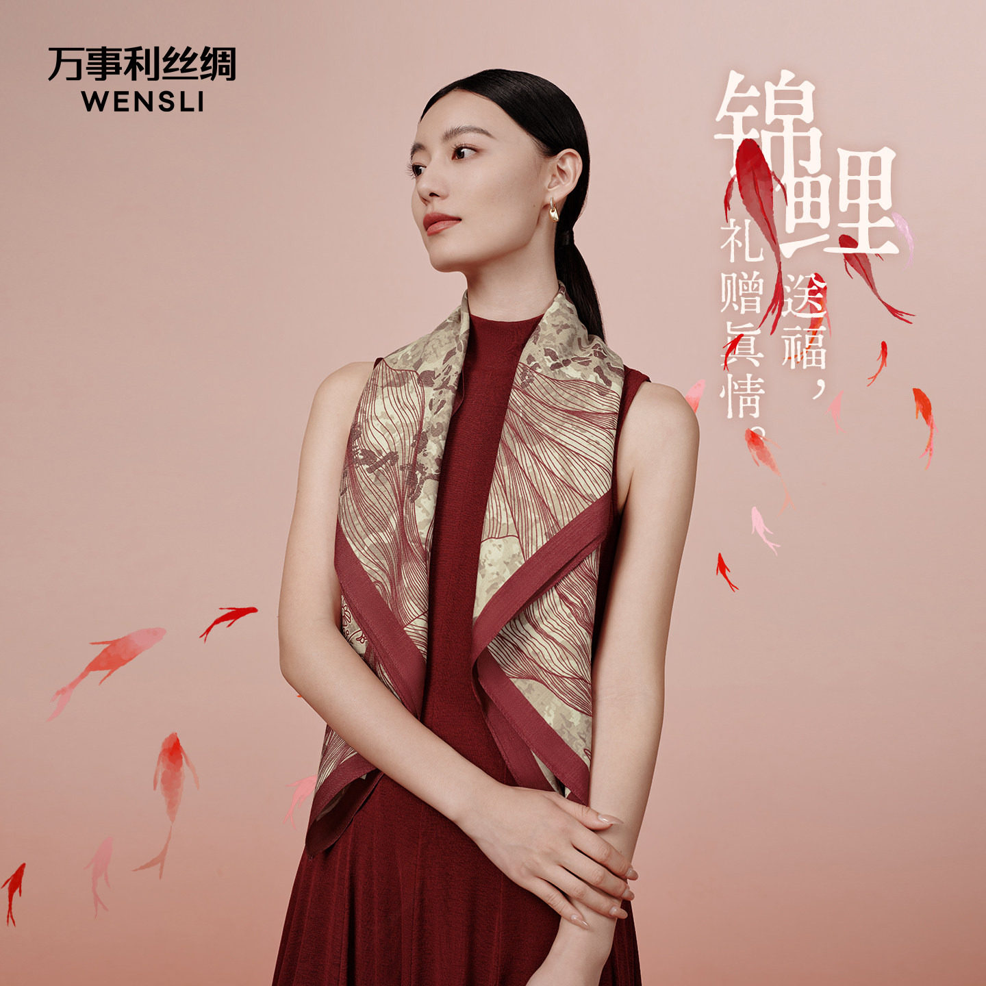 [生日礼物]万事利真丝丝巾羊毛红色围巾女送妈妈桑蚕丝披肩锦鱼绘