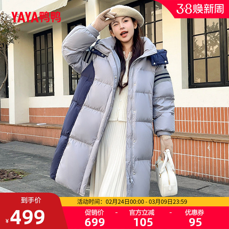 鸭鸭羽绒服女2025冬季新品中长款时尚连帽潮流撞色鸭绒保暖外套Y
