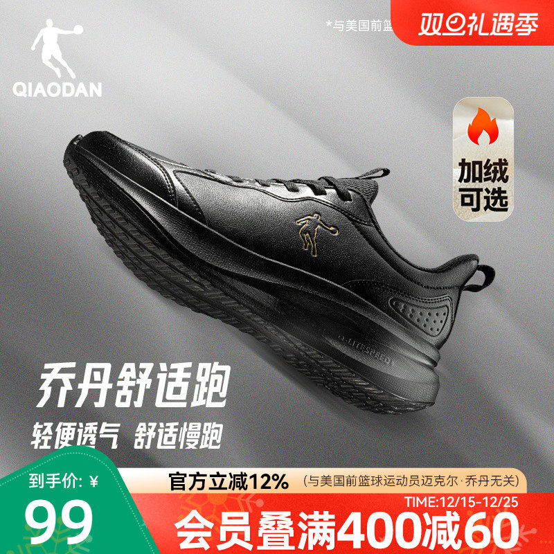 乔丹皮面加绒防水冬季运动鞋男鞋跑步鞋轻便软底减震休闲黑色跑鞋