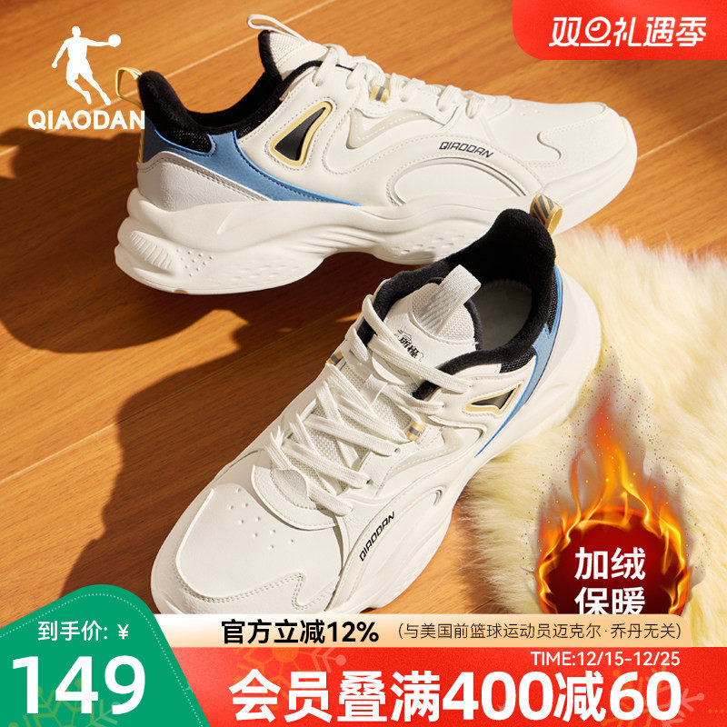 乔丹加绒保暖休闲鞋男运动鞋2025冬季皮面防水老爹鞋白色百搭鞋子