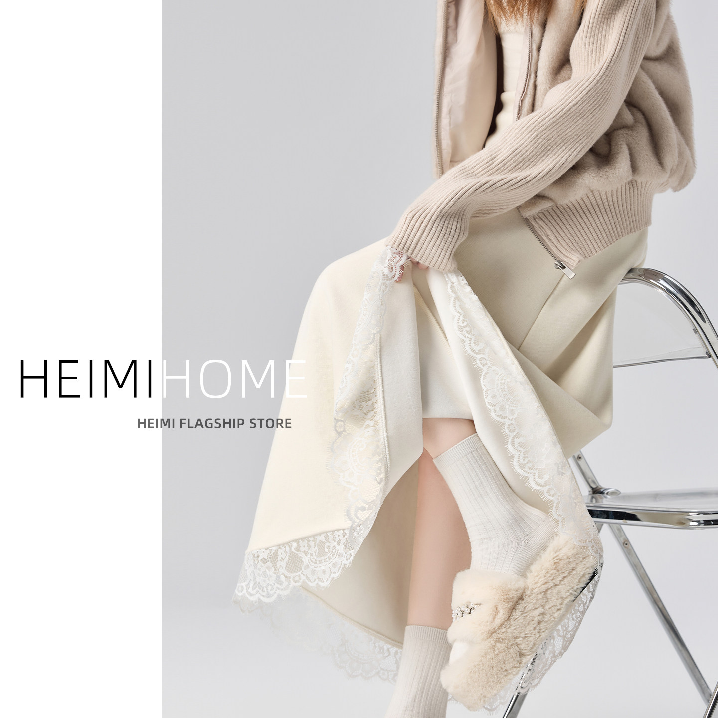 杏色加绒糯米裙女秋冬季高腰加厚A字羊绒裙中长款蕾丝花边半身裙