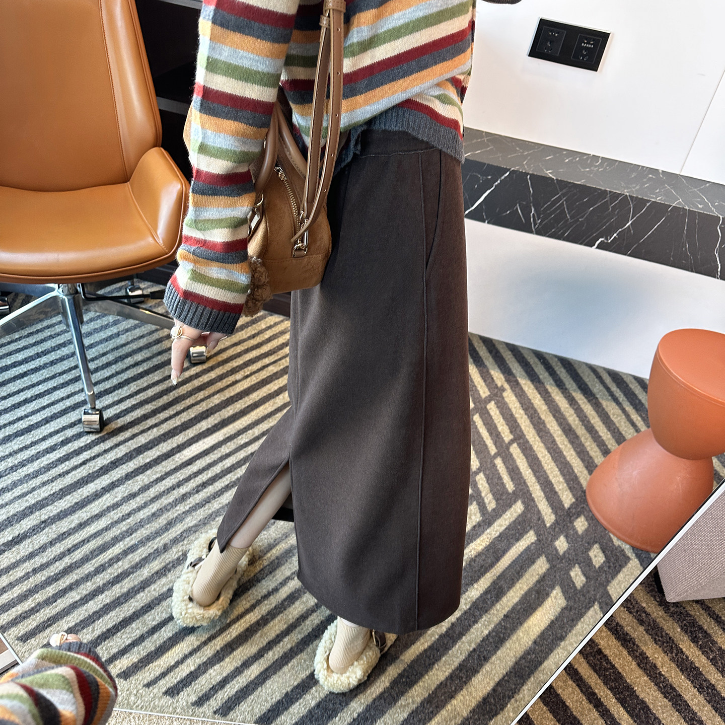 卡其色直筒半身裙女春秋冬高腰开叉包臀a字裙中长款羊绒毛呢裙子