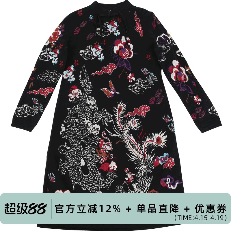 花木深针织毛衣连衣裙女春秋翻领新款旗袍裙中式提花美丽诺羊毛裙