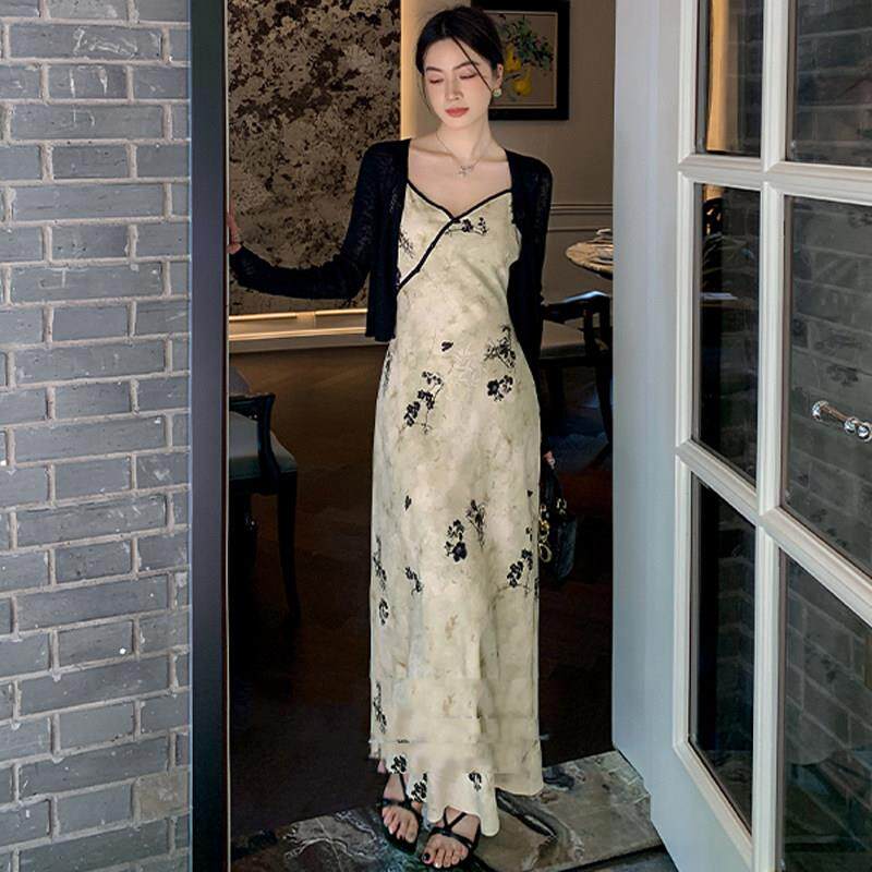 Ethmmia春夏新中式碎花吊带连衣裙针织衫两件套气质国风旗袍长裙