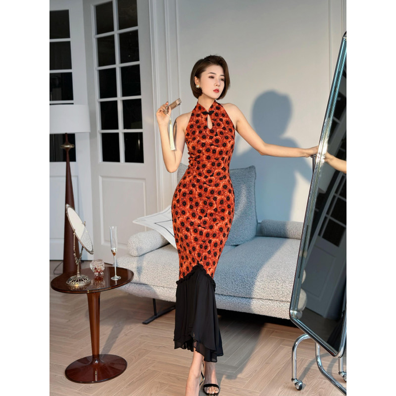 XULU原创秋季轻奢针织印花压胶连衣裙气质修身优雅复古斜襟长旗袍