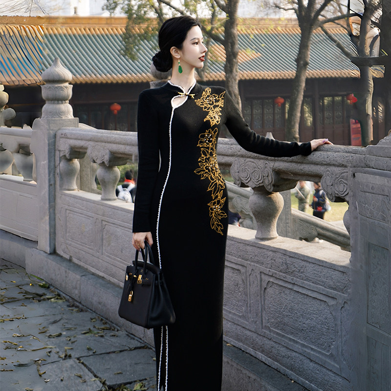 新中式弹力针织连衣裙旗袍女新中式日常高级感黑色长裙港工兰妃娘