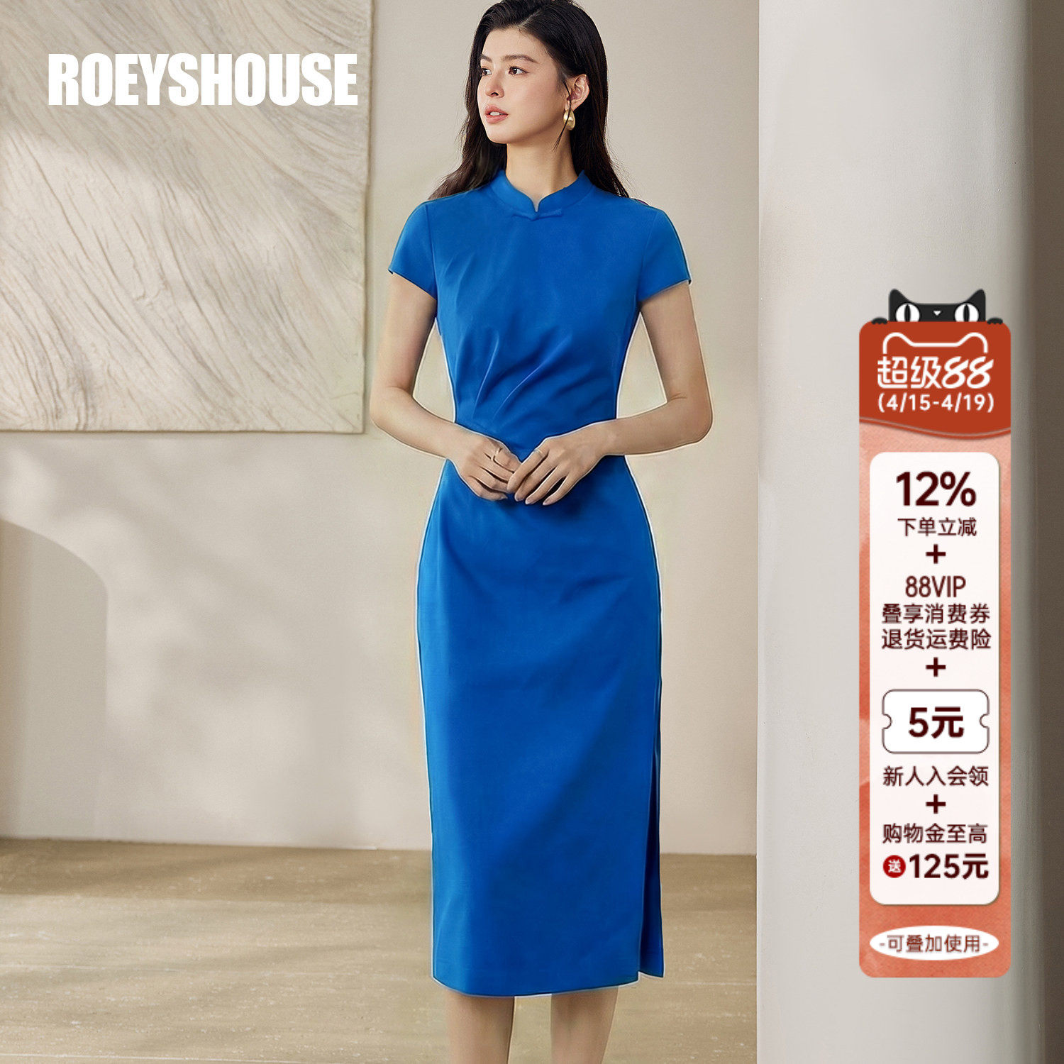 罗衣国风蓝色褶皱收腰连衣裙女夏新中式立领修身针织旗袍裙13651