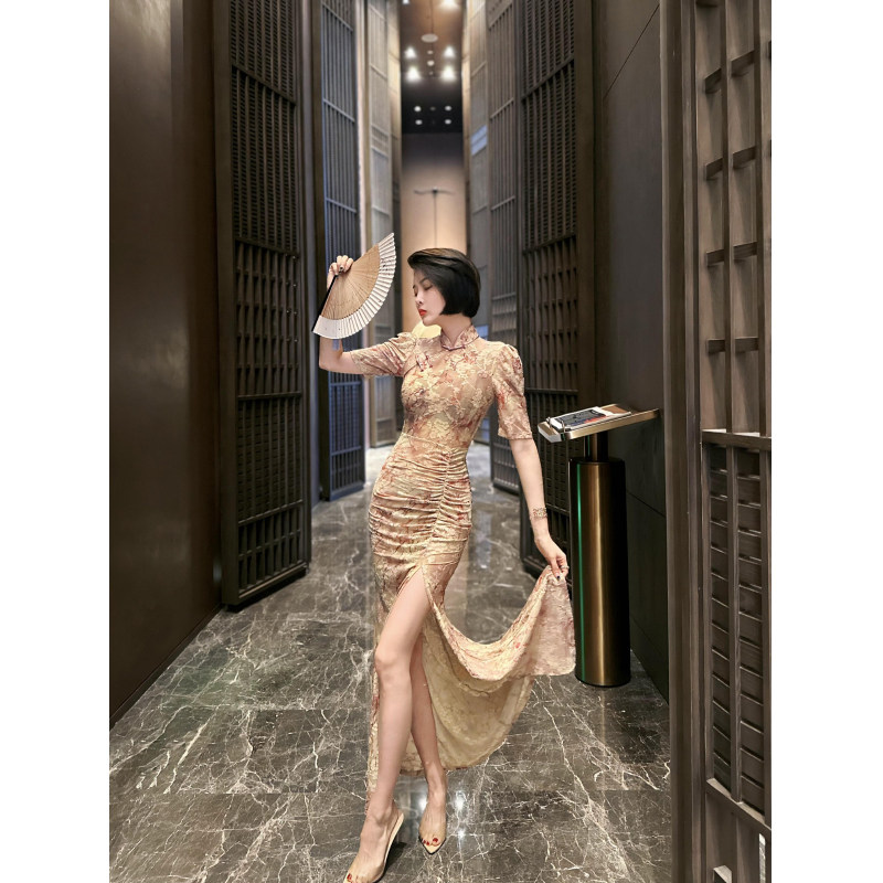 XULU原创夏季针织剪花复古连衣裙优雅名媛感褶皱斜襟中长袖旗袍