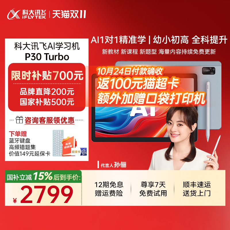 【保价双11 限时补贴700元】科大讯飞AI智能学习机P30Turbo小学初中高中智能学生平板高中学习机旗舰店