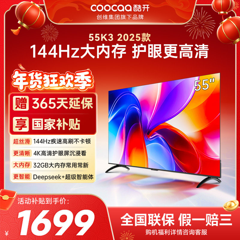 创维酷开K3 55英寸2025款4K大内存网络智能投屏液晶家用电视机65