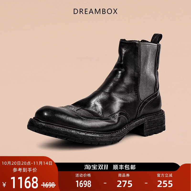 dreambox钧博vibram男靴水洗马皮布洛克雕花切尔西靴手工男士靴子