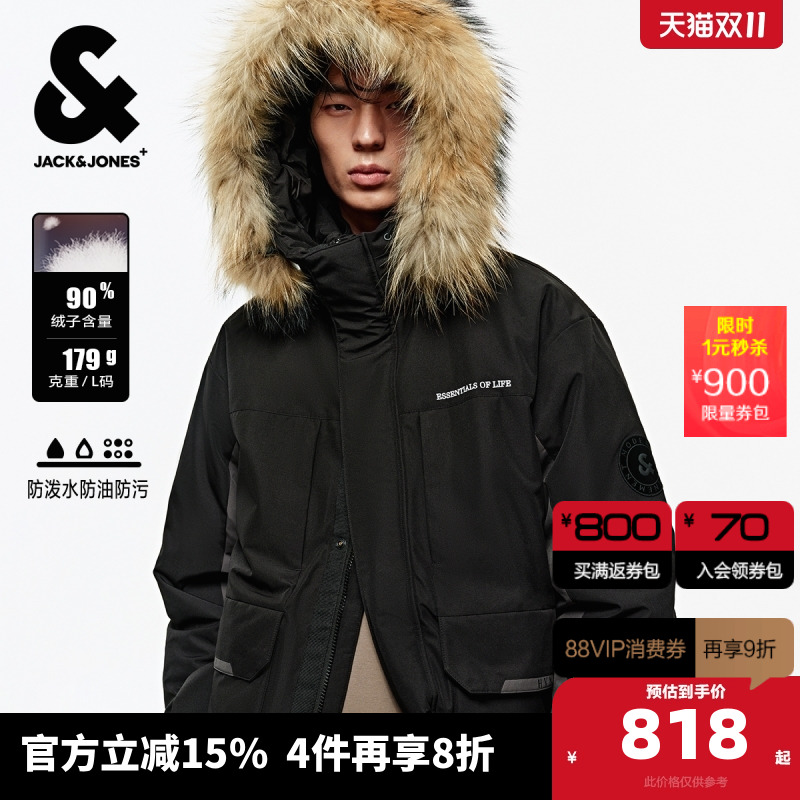 三防 杰克琼斯男装士羽绒服秋冬新款中长款工装大毛领外套大衣厚