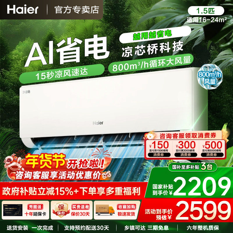 海尔1.5匹空调AI舒适风变频冷暖一级能效家用壁挂式空调冷暖官方