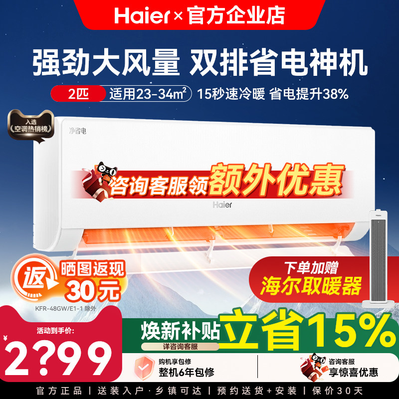 海尔洗空气家用1.5匹2匹客厅新一级能效冷暖两用卧室壁挂式空调机