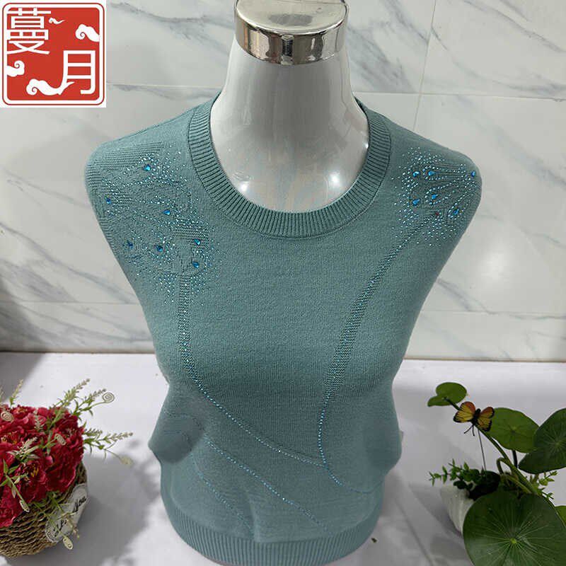 妈妈装秋季新款纯色大码套头针织上衣中老年女装时尚圆领镶钻毛衣